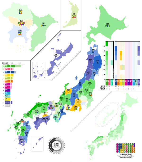 1. Configuración de bloques políticos postelectoral en Japón, por número de asientos y partido mayoritario.