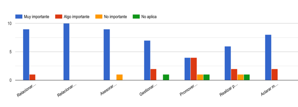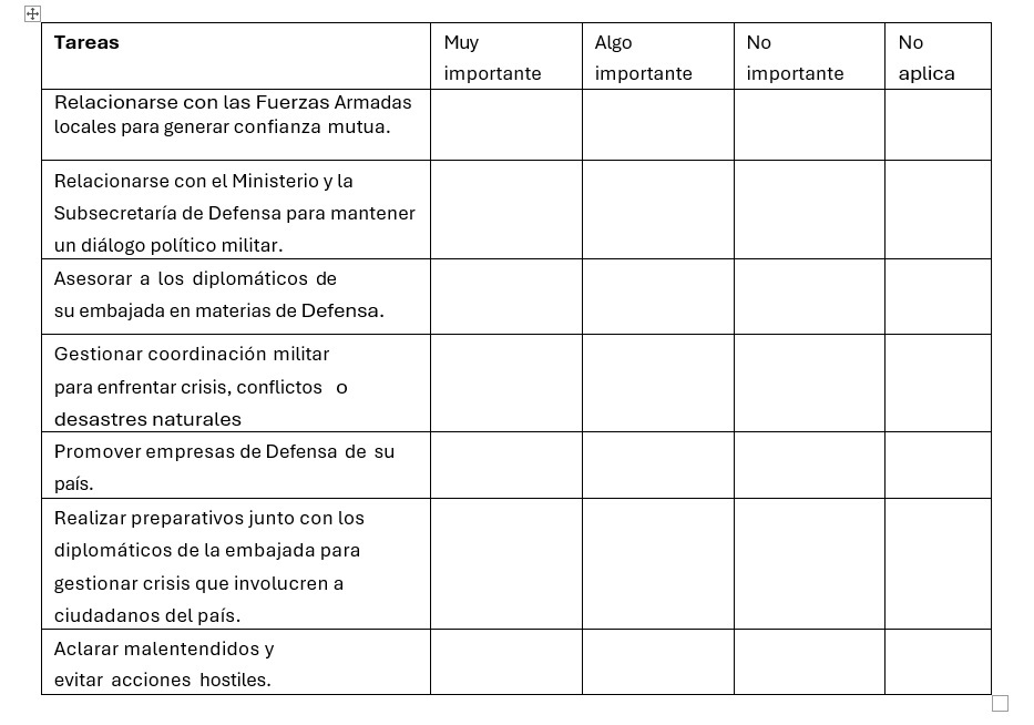 1. A continuación, se muestra un listado de posibles tareas que realiza en su calidad de agregado de Defensa. Por cada una de las tareas que se mencionan, seleccione cuáles considera muy importante, algo importante y no importante, o si no aplica.